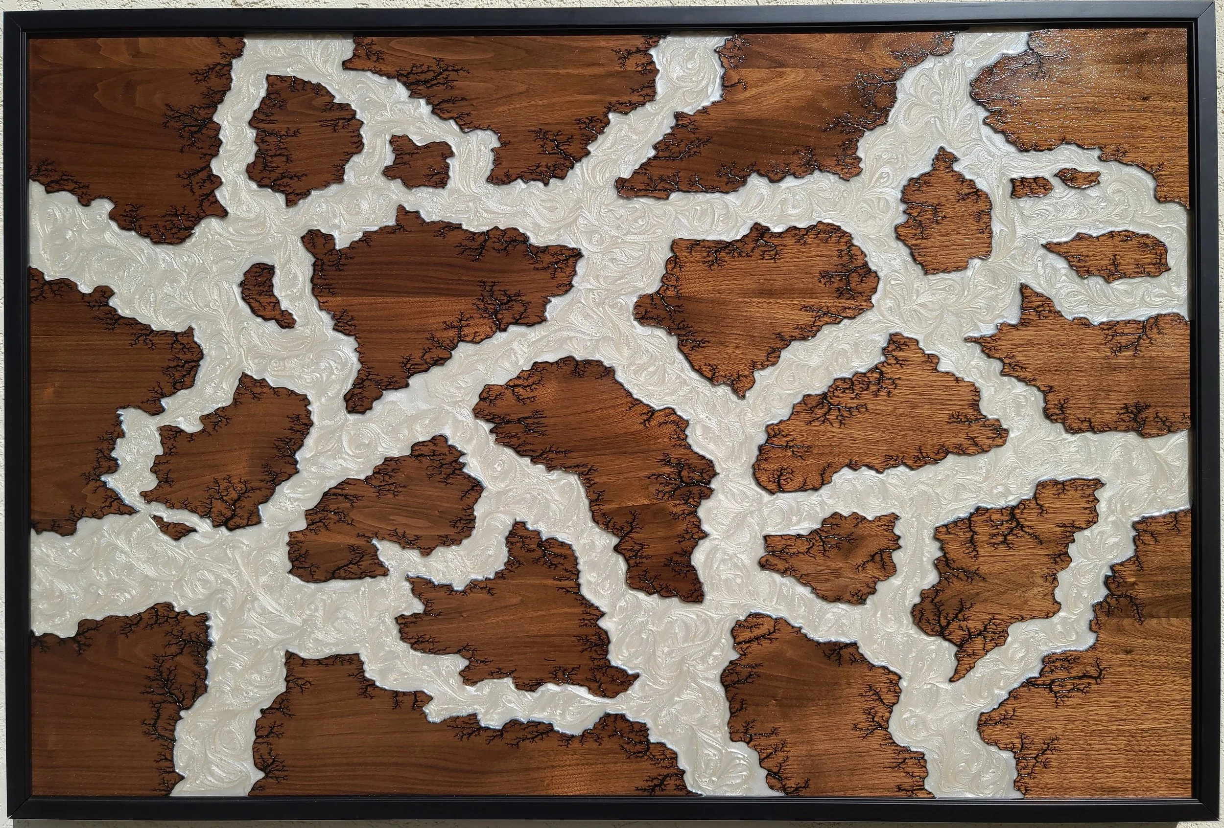 I have made several Pangea’s with walnut with pearl epoxy, each unique, to some degree the electricity goes where it wants to. It is an impactful combination. I made this shortly after the Beverly Hills Art Show in October 2023 after 2 previous version that were the result of 2 customers wanting the same previous piece.